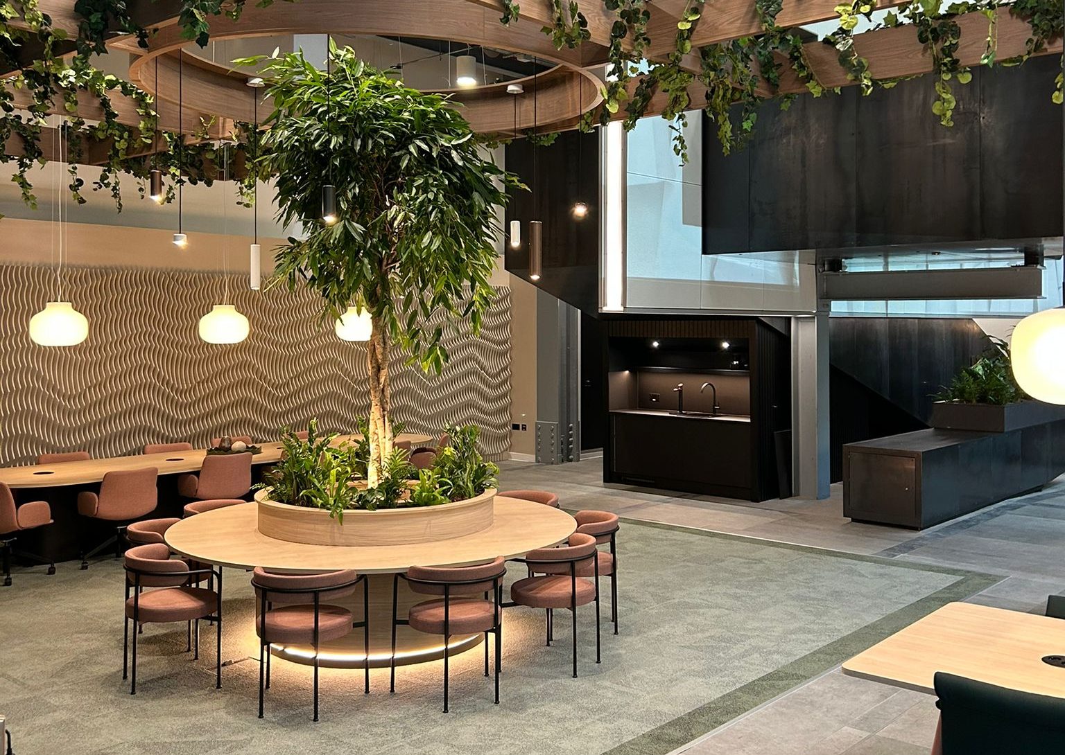 The reception area in Circle Square No.1 needed updating to match the standard of the surrounding buildings. After a full strip back, we developed the space with a new reception desk, lounge area, coworking desks, kitchenette, meeting booths, feature wall, ceiling raft, flooring, and centrepiece tree in a bespoke table, complemented by the rest of the biophilia added.