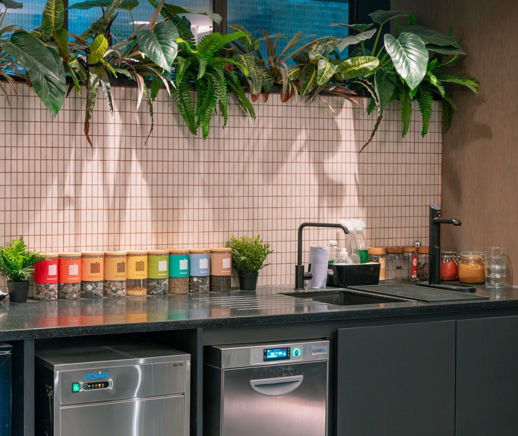 At the centre of the space sits a bespoke café counter finished in terrazzo, providing a durable focal point while incorporating sustainable materials. Under-counter refrigeration and back-of-house equipment were also procured and integrated as part of the fit-out.